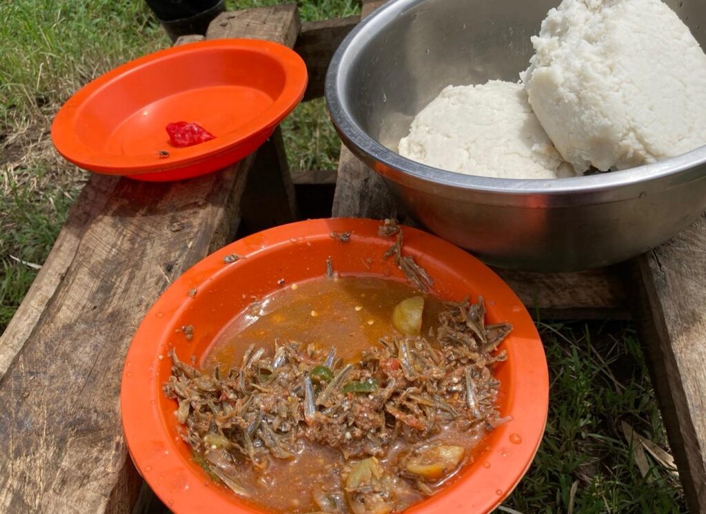 Zum Mittagessen gab’s Ugali mit Fischsauce. Ugali ist die in der ostafrikanischen Sprache Swahili verwendete Bezeichnung für einen Getreidebrei aus Maismehl.