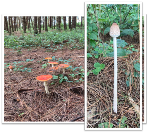 Fliegenpilze gibt’s auch hier. Der andere Pilz ist ein Schirmling, verwandt mit dem Parasol, aber um einiges schlanker, so wie die Menschen hier.
