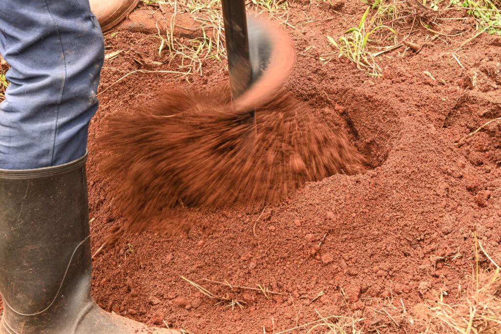 Der Lehmboden weist in 30-40 cm Tiefe eine sehr harte Schicht auf, die die Wurzeln kaum durchdringen können. Also haben wir einen Bohrer angeschafft.