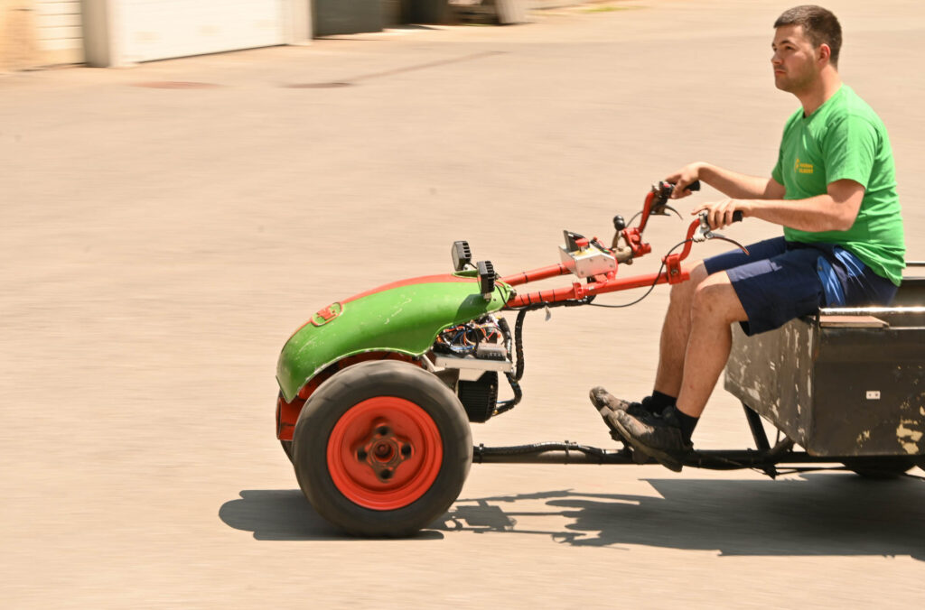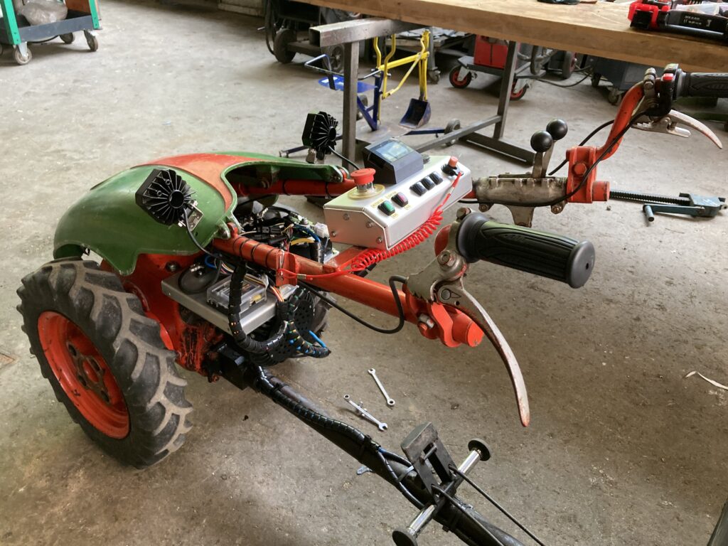Nach vier Tagen (und langen Nächten, weil’s ja noch anderes zu reparieren und viel zu erklären gab) war es geschafft. Der E-Schlepper fährt mit Pflug, anderen Anbaugeräten …