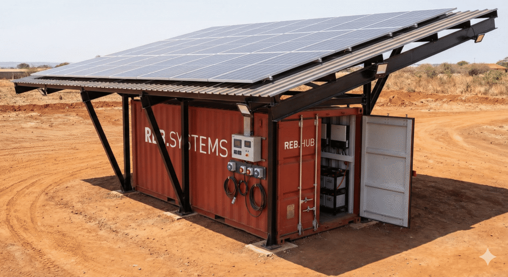 Eine kompakte Off-Grid-Servicestation mit Solar-Überdachung, die als zentrale Wartungswerkstatt, Batterietausch-Depot und lokale Stromquelle für die Gemeinschaft dient. Incl. Multi-Slot-Ladestation mit bidirektionalem Wechselrichter, die sowohl die Traktorflotte versorgt als auch die Energieversorgung der Gemeinschaft sicherstellt.
